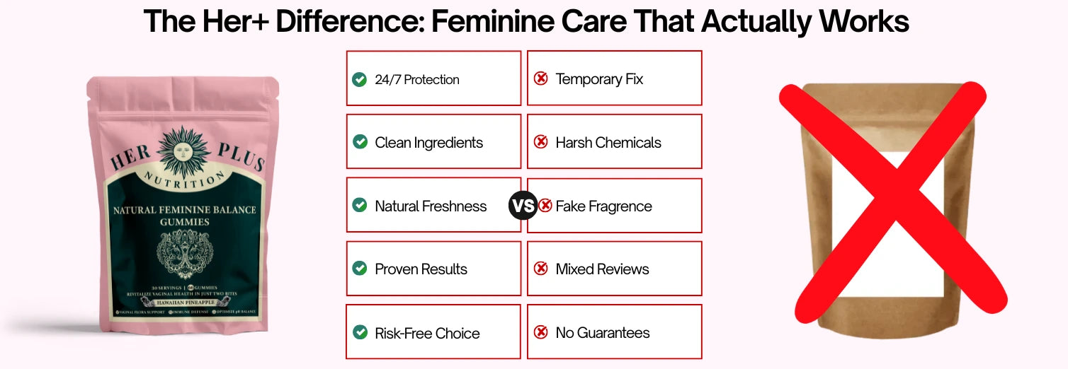 Her+ targets the root cause with probiotics and nutrients to restore balance and support healthy vaginal flora. Say goodbye to odor, discomfort, and overthinking—hello to fresh, clean confidence every day.